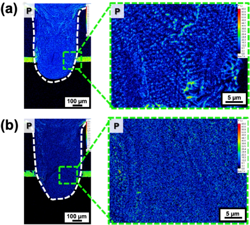 반면 Circular +Wobble 패턴을 적용한 용접부(그림 11(b))에서는 비교적 균질한 P 성분 분포를 확인할 수 있으며, 셀 경계의 응고 편석 또한 완화된 결과를 확인할 수 있다. 이는 Circular +Wobble