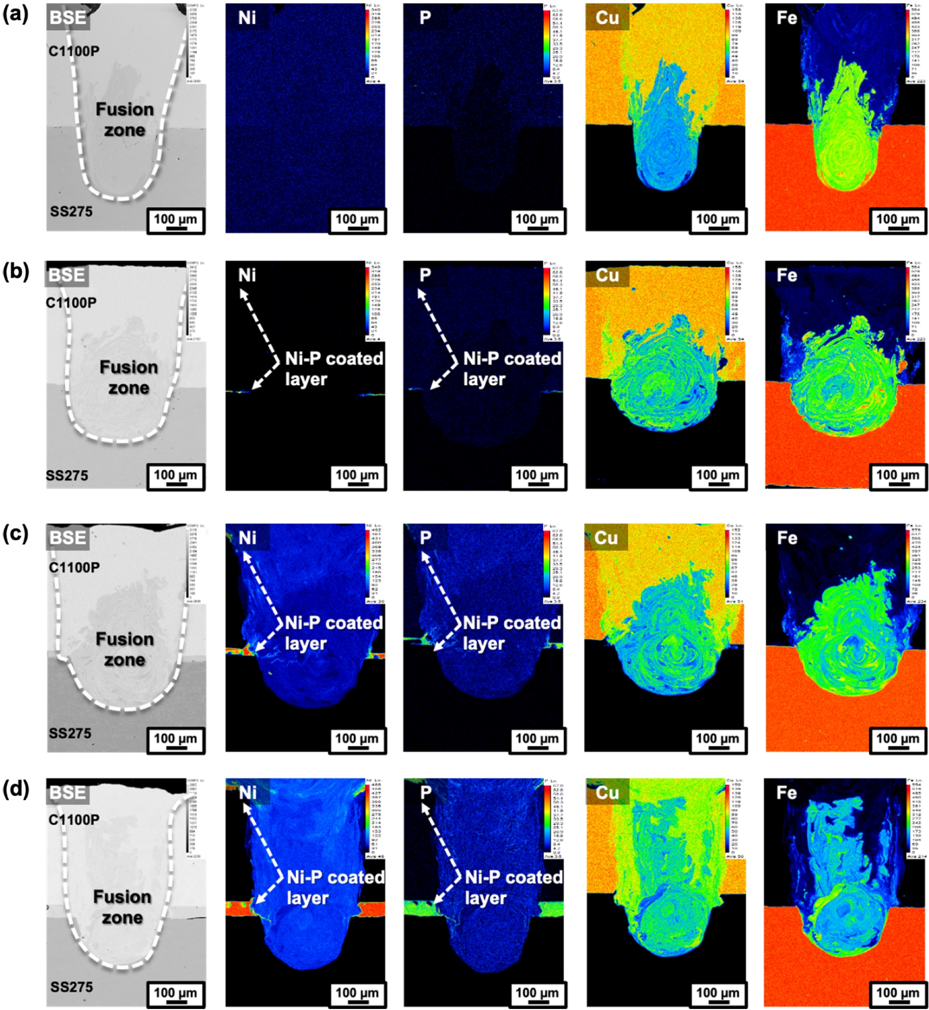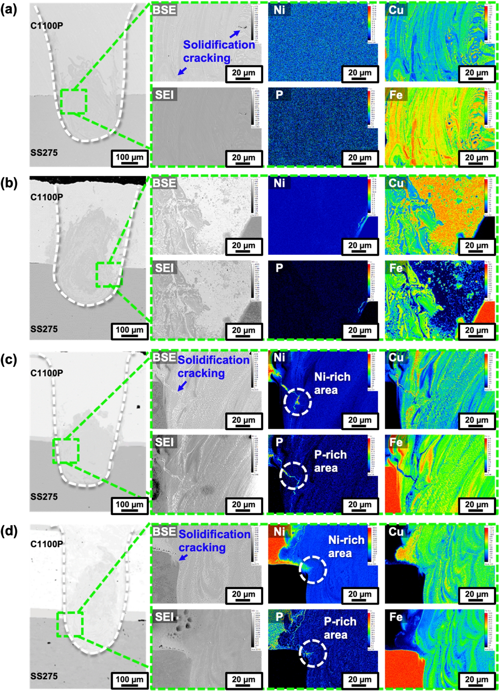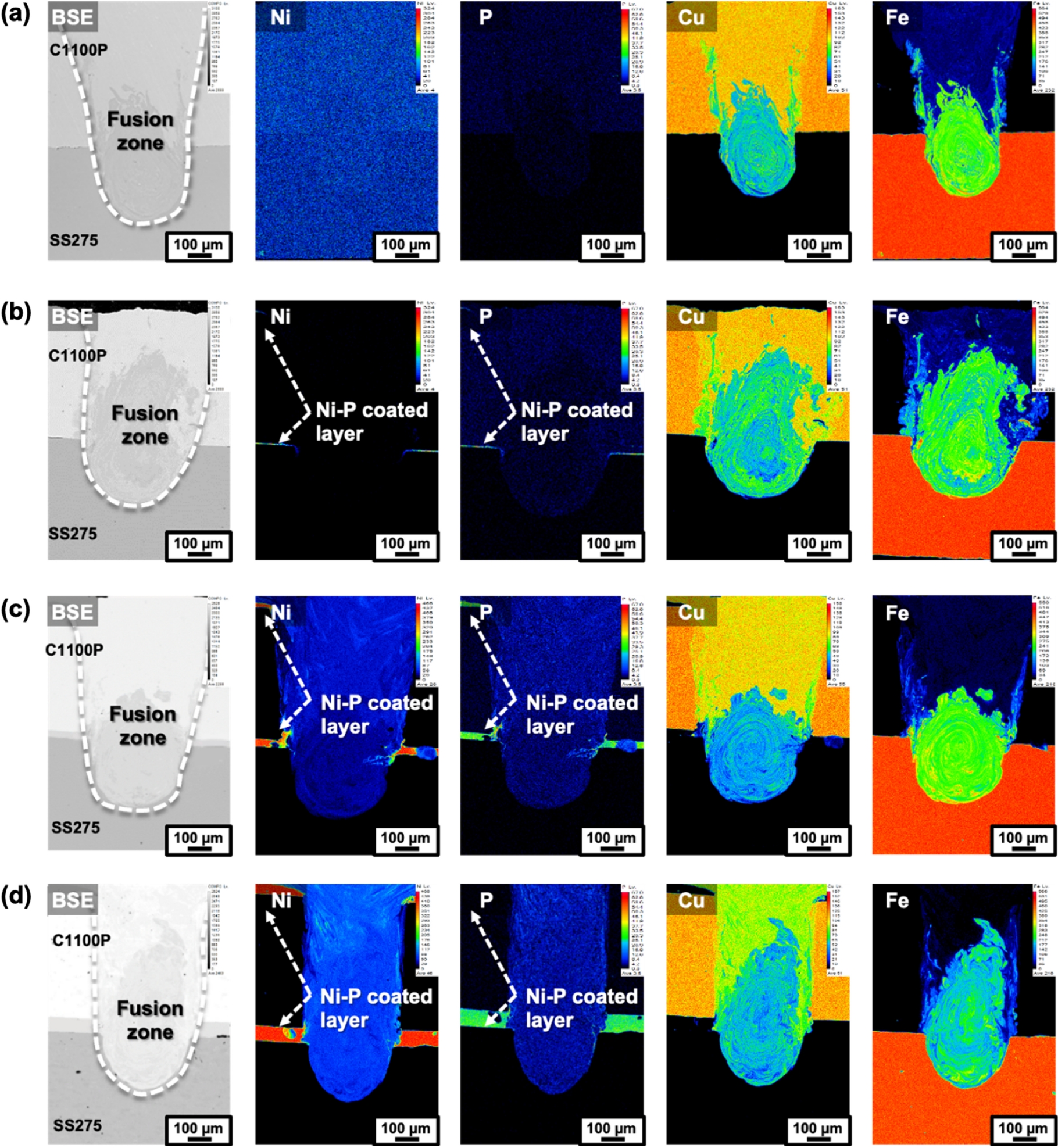 및 응고 온도 범위 축소를 통해 응고균열을 억제할 수 있으며 10 μm Ni-P 도금 Cu에서 무균열 용접부를 확보할 수 있었다. 즉, Cu-Steel