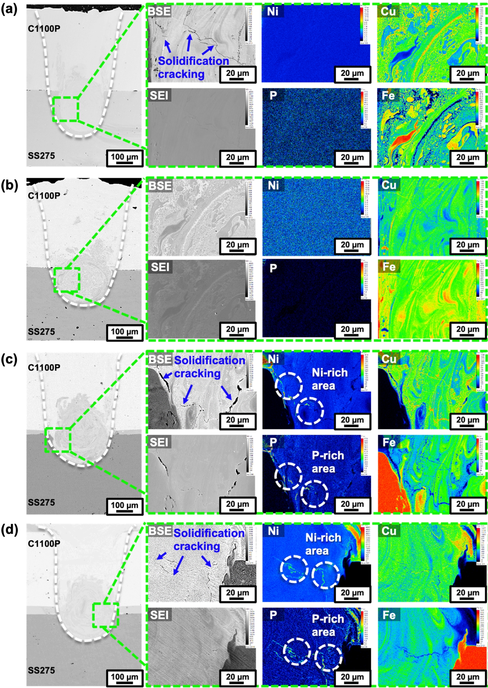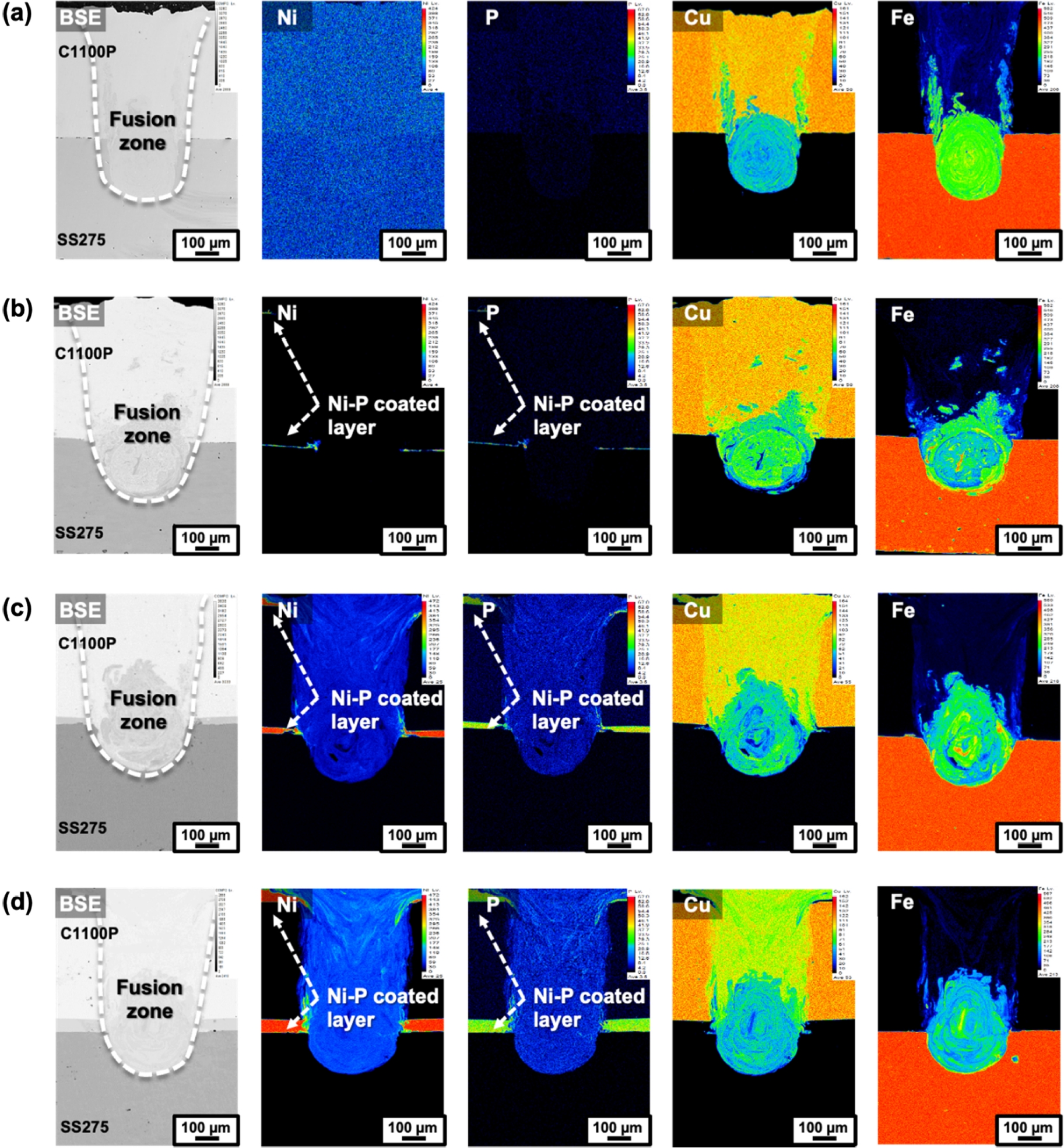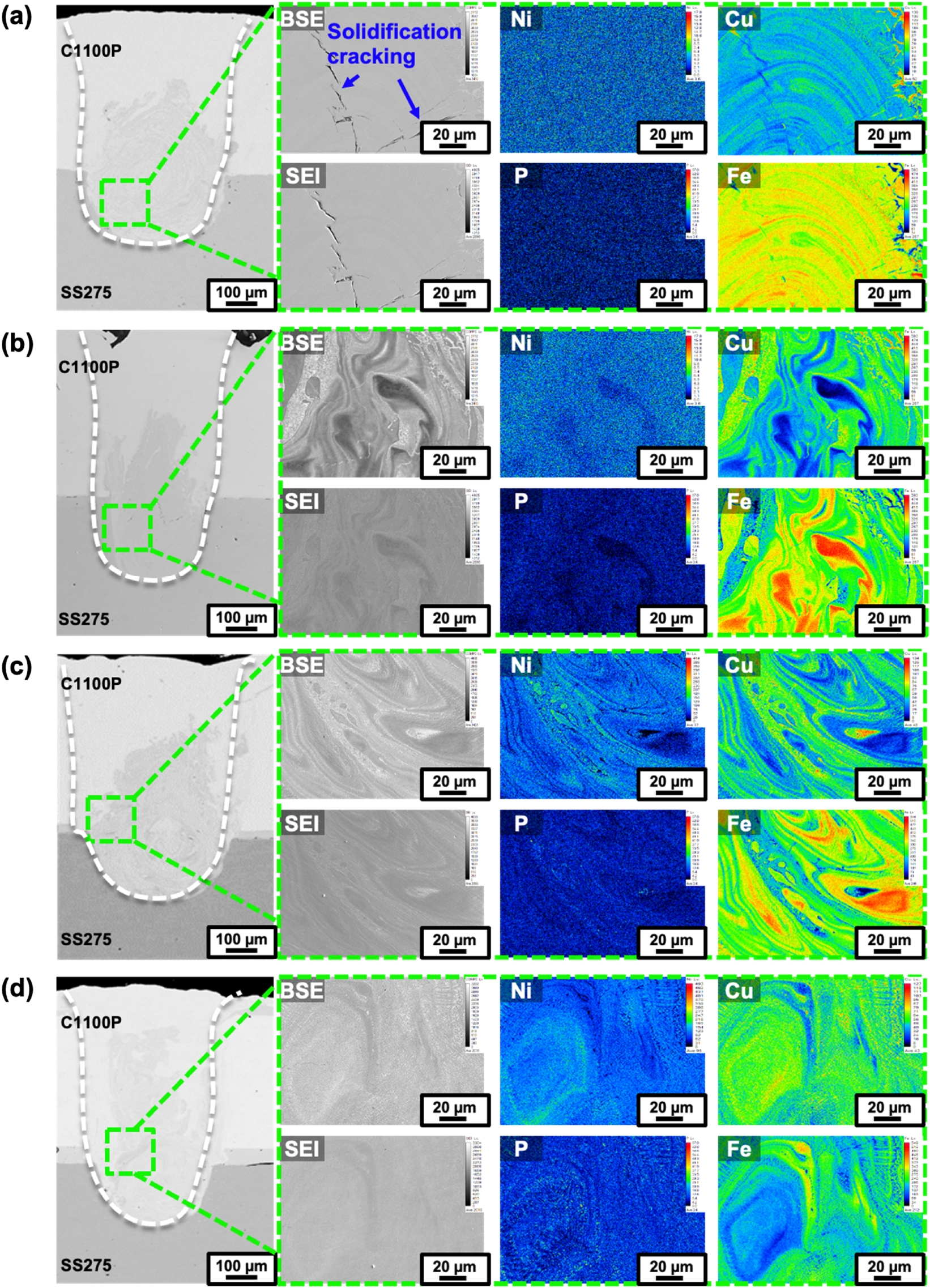 및 응고 온도 범위 축소를 통해 응고균열을 억제할 수 있으며 10 μm Ni-P 도금 Cu에서 무균열 용접부를 확보할 수 있었다. 즉, Cu-Steel
