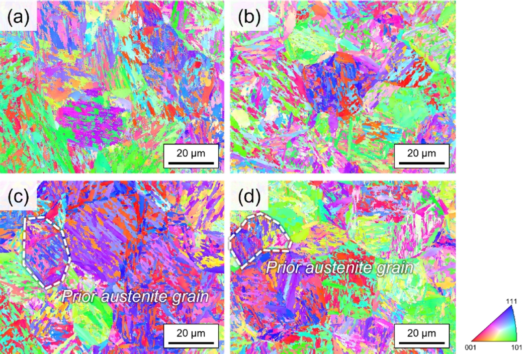 ๋์ดํธ ๊ฒฐ์ ๋ฆฝ ํฌ๊ธฐ๋ฅผ ์ธก์ ํ์๋ค[22]. ๋ณด๋ค ์์ธํ ๋ฏธ์ธ์กฐ์ง์ ์ ์ํ๋ฐฉ์ฐ๋ํ์ (Electron Backscatter Diffraction, EBSD, Model: TSL Hikari