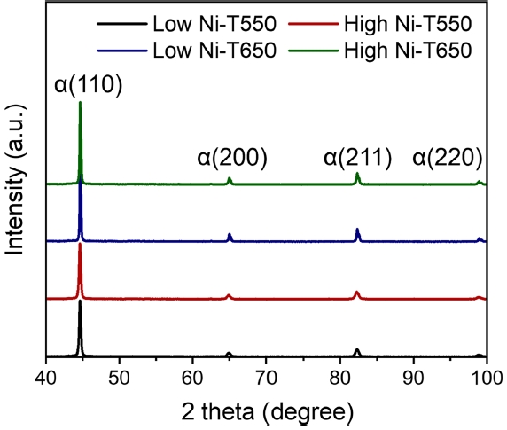 ๋์ดํธ ๊ฒฐ์ ๋ฆฝ๊ณ, ์์ถ๋ฌผ ๋ฑ์ด ์กด์ฌํ๋ค[26,29]. XRD ๊ฒฐ๊ณผ์ ๋ฐ๋ฅด๋ฉด, Ni ํจ๋์ด ๋ค๋ฅธ ๋ ์ํธ์์ ๋์ผํ๊ฒ ฮฑ ๊ธฐ์ง๋ง์ด ๋ํ๋ฌ๊ณ , ์ ์๋ฐ๋ ์ฐจ์ด๋ ๋ฐ์ํ์ง ์์๋ค. ๊ตฌ์ค์คํ