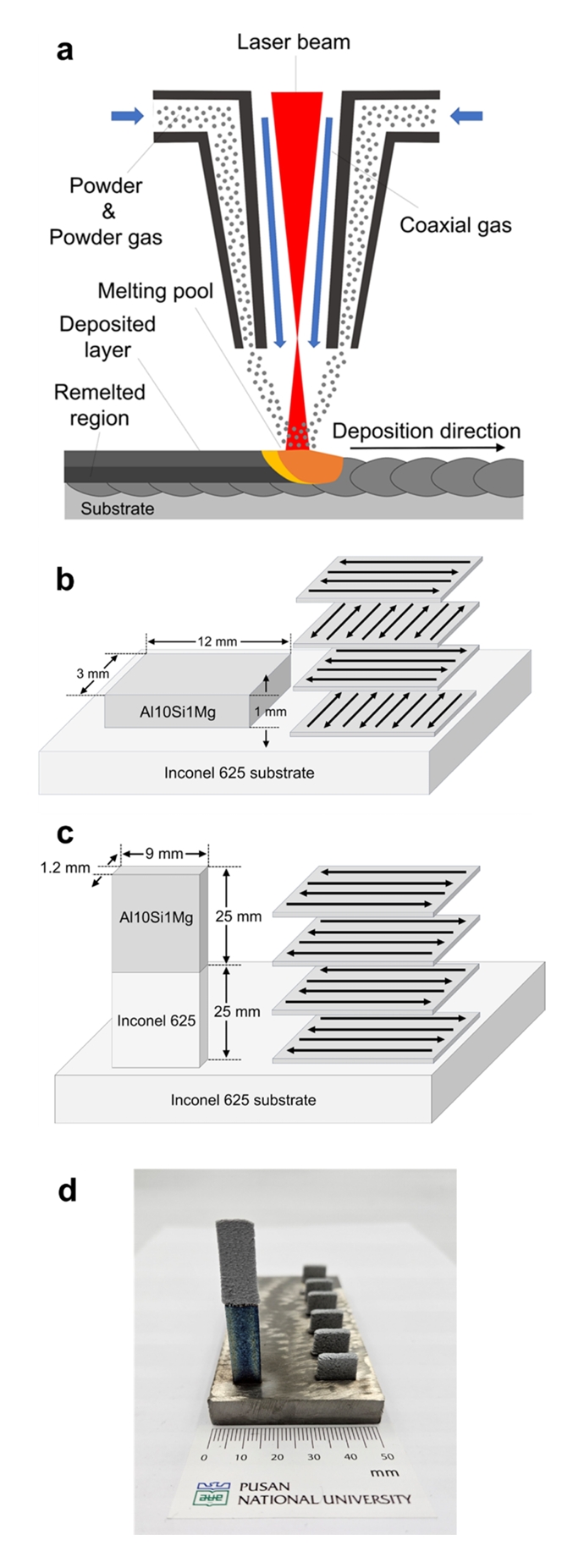 In this study, AlSi10Mg was L-DED processed on an Inconel 625 substrate with five