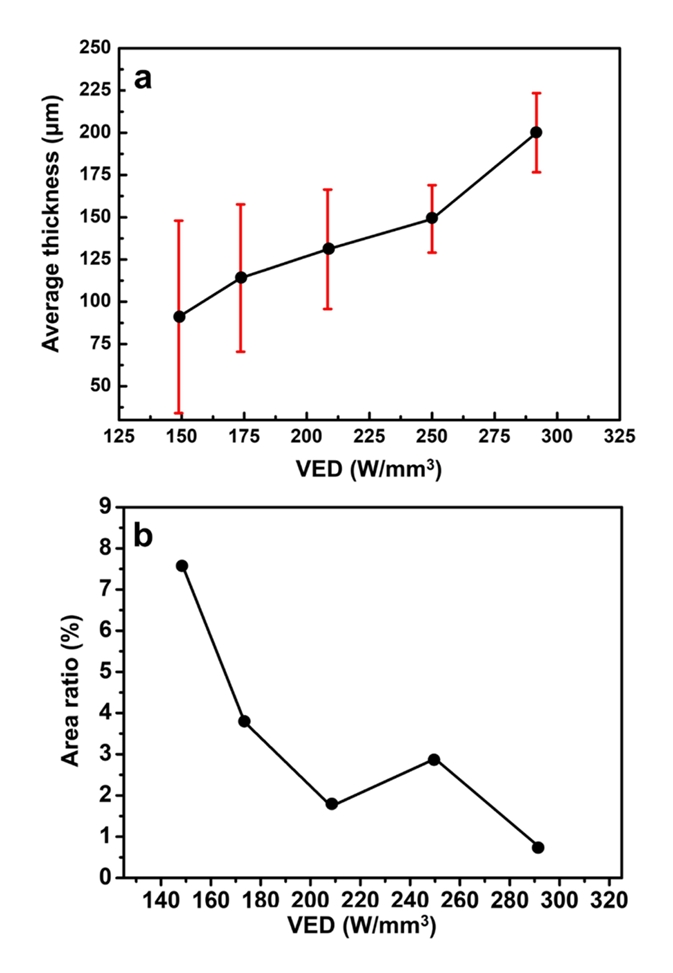 found that the lower the VED was, the higher the tensile interfacial strength of the