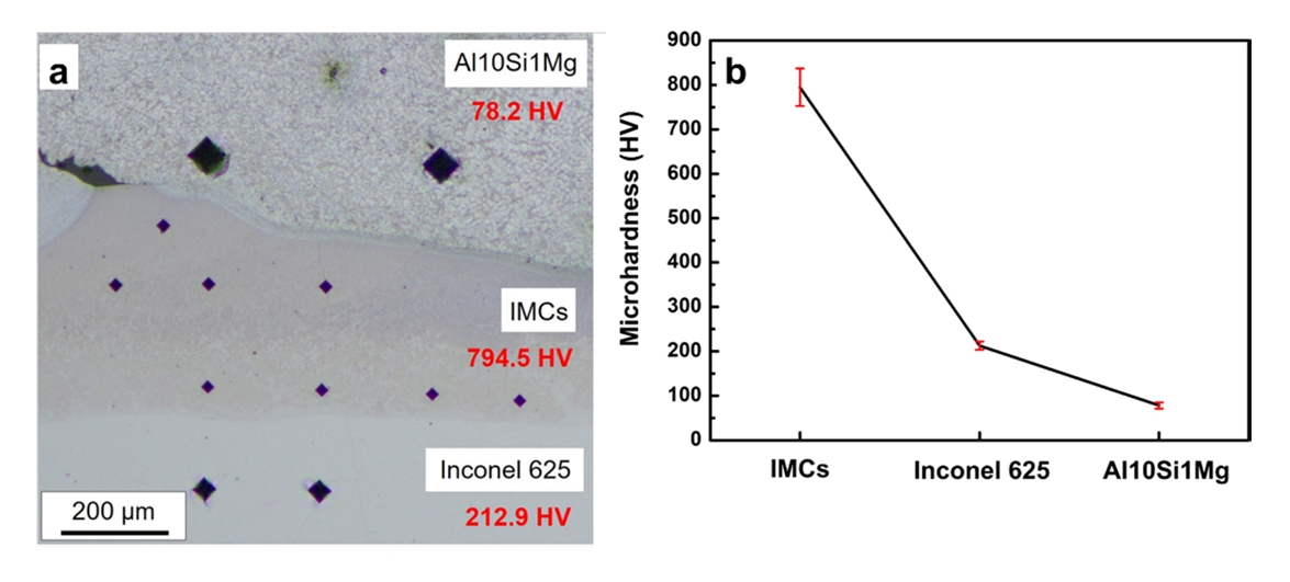 of the IMC phase close to the Inconel 625 substrate was close to that of Al3Ni5. Considering that the diffusion rate of nickel in Ni-Al IMCs is extremely slow, it