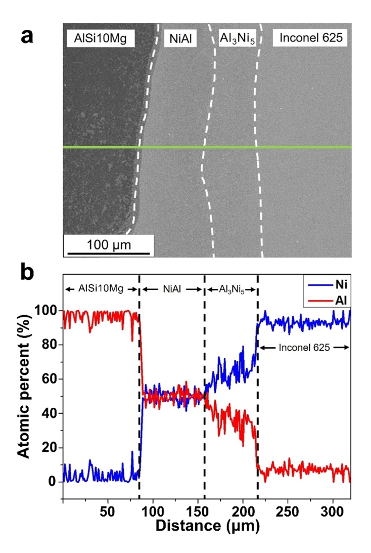 The IMC phase close to the deposited AlSi10Mg was inferred to be NiAl while the composition