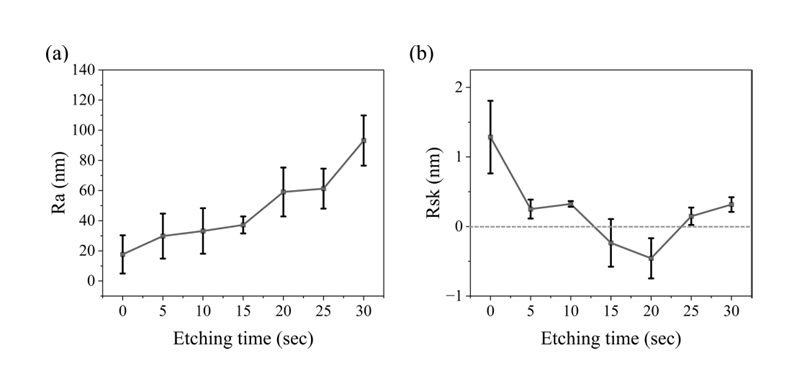 AFM 분석을 통해 측정된 조도 값 중 평균 조도(Ra)와 왜도(Rsk)를 에칭 시간에 따라 나타내었다 (그림 2). 그림 2 (a)의 Ra는 전체 측정 영역 내의 높이 편차의 절대값 평균으로 정의되며, 표면의 전반적인 거칠기 수준을 정량적으로 나타낸다. 본 실험에서는 에칭 시간이