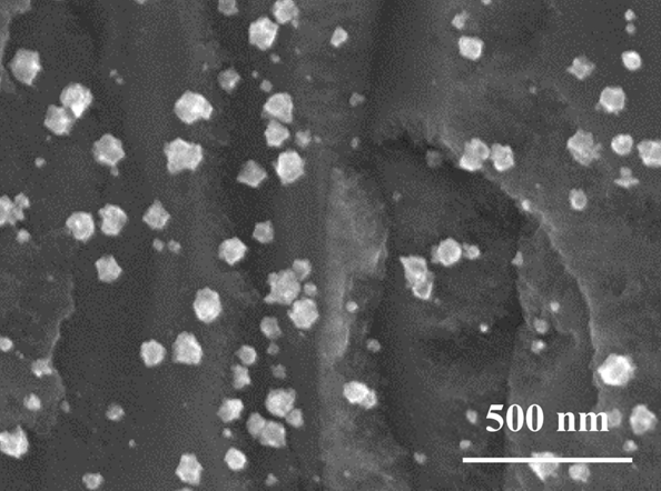 실제로 그림 5와 같이 침지 1초 후에도 금 입자의 석출이 관찰 될 만큼 갈바닉 치환반응은 순간적으로 일어났다는 것을 확인할 수 있었고, 그림 3 (a), (b)의 5초, 30초 시편의 표면을 비교하면 금 석출 입자의 크기만 증가하였을 뿐 밀도는 유사하게 유지되는 것을 근거로 갈바닉 반응 이후 대부분의 노출면은