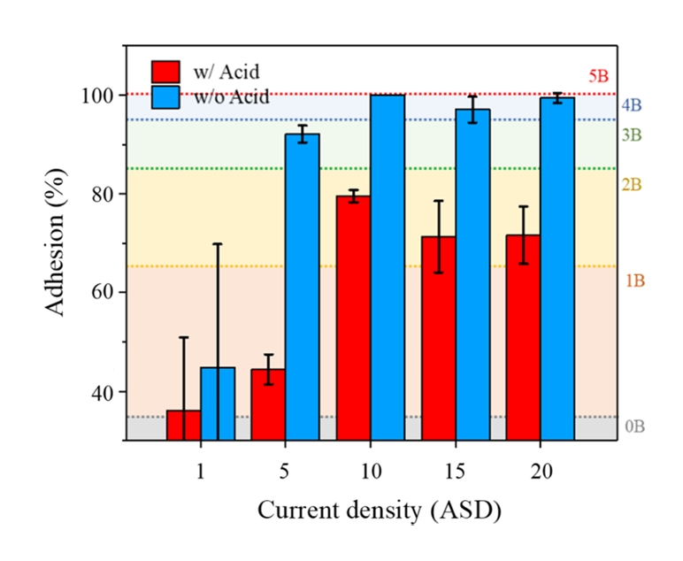 이에 따라 몰리브덴의 잔존 산화막을 제거하기 위해 HCl과 NH4F의 혼합산을 이용한 산 활성화 공정을 적용한 결과, 밀착력이 급격히 향상되었다. 또한 스트라이크 전류밀도에 따라 10 ASD 조건에서 최대 밀착력인