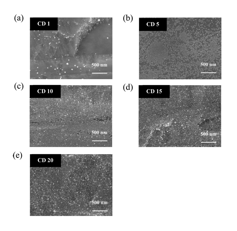 30초 동안 전류밀도를 1, 5, 10, 15, 20 ASD로 설정하였으며, 그 표면 형상을 FE-SEM으로 분석한 결과는 그림 8에 제시하였다.