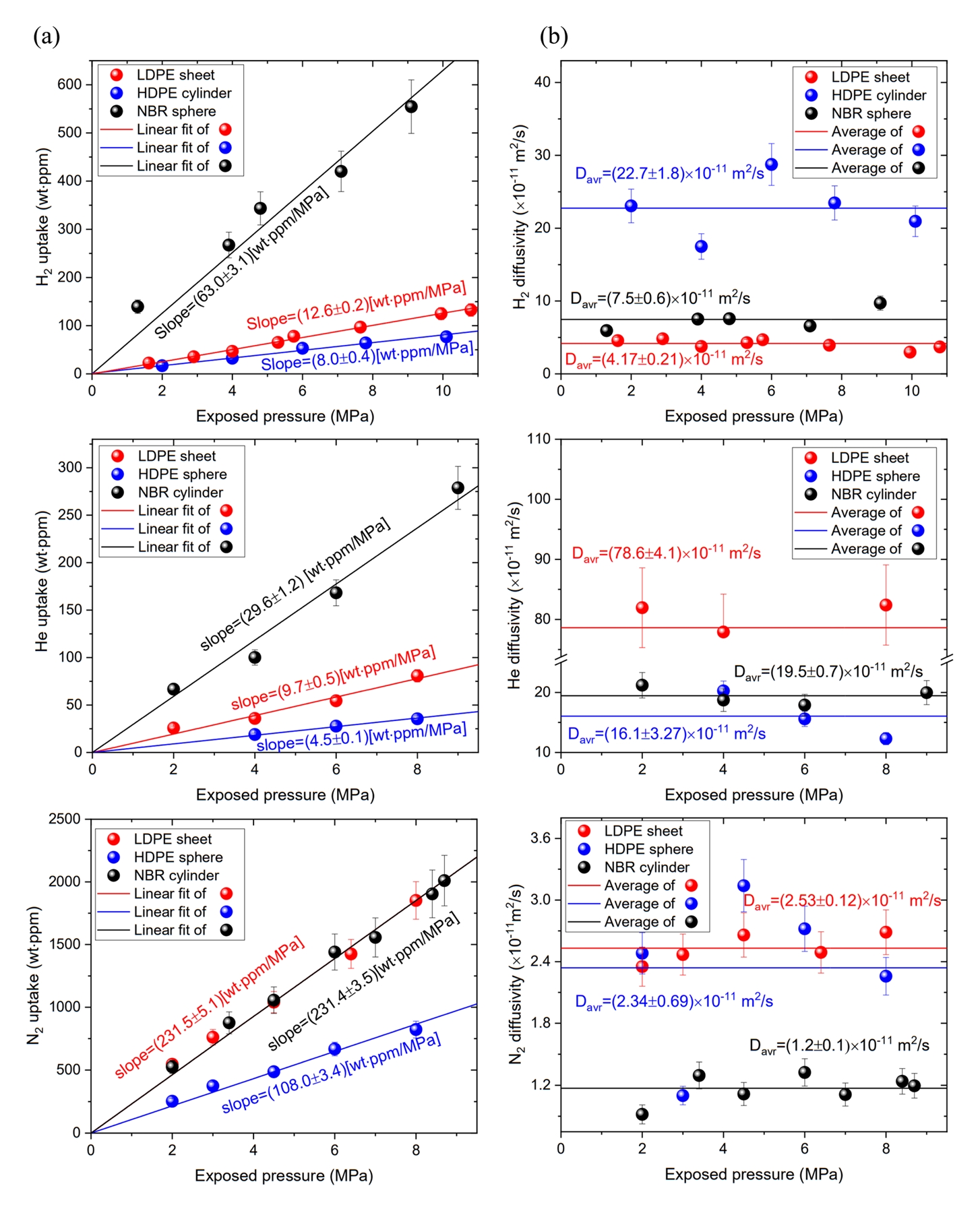 mg is the molar mass of the gas used and d is the density of the specimen. Permeability (P) is determined by the product of diffusivity (D) and solubility (S); i.e., P=DavrS. Davr, S, and P obtained for the NBR, HDPE, and LDPE specimens are represented in Table 2. The investigation results provide a comprehensive comparison of how each polymer