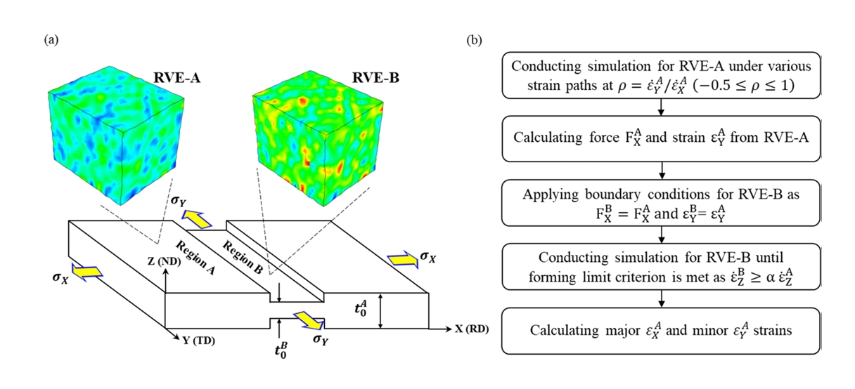 FLD 데이터는 결정 소성 유한요소 모델과 M-K 모델을 결합한 가상 성형 시험 모델을 통해 계산하였다. 그림 3 (a)는 FLD 분석을 위한 CPFEM-MK 모델을 보여준다. 외측 영역(RVE-A)과 홈 영역(RVE-B)을 나타내는 두 개의 RVE가 고려되며, RVE-B의