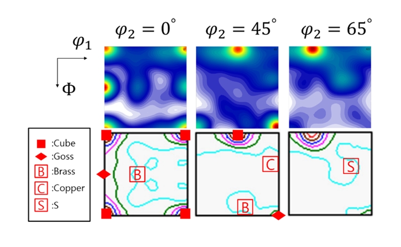 결정 방향 데이터에는 소재를 구성하는 집합조직의 비율적 특성을 반영하기 위해 7가지 집합조직(cube, r-cube, goss, r-goss, brass,