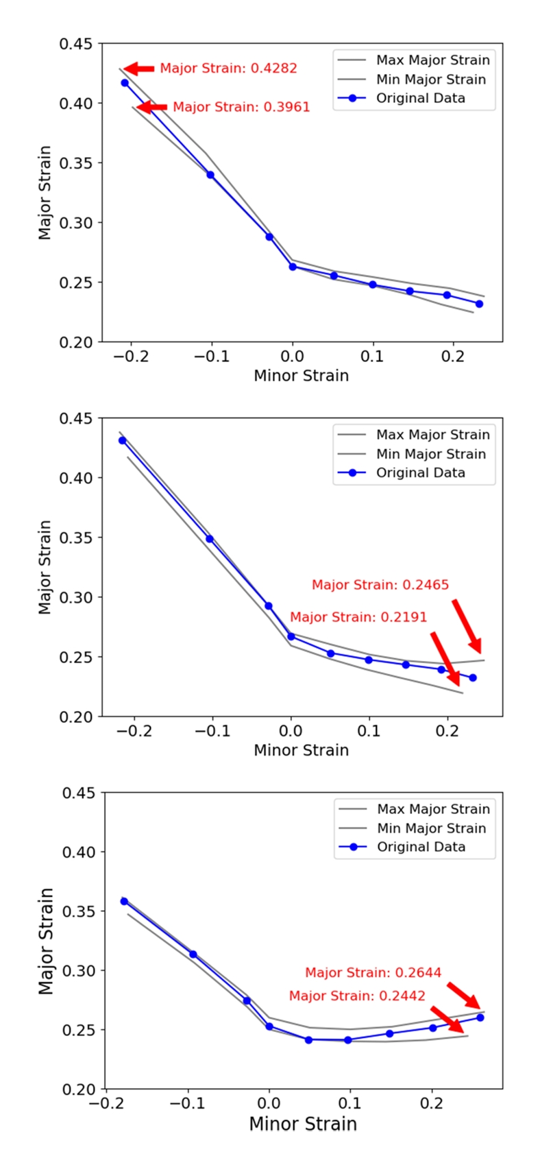 포인트로 표현되었다. FLD의 특성상, 주 변형률과 부 변형률이 특정한 관계를 유지하며 해석이 진행되므로, 모델 학습을 위해 데이터 포인트를 원점(0,0)으로부터의