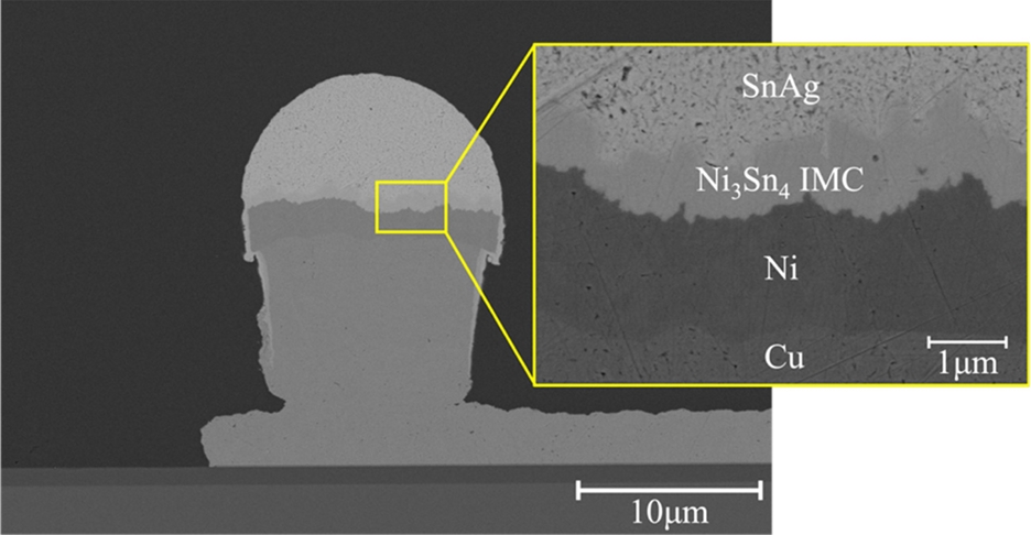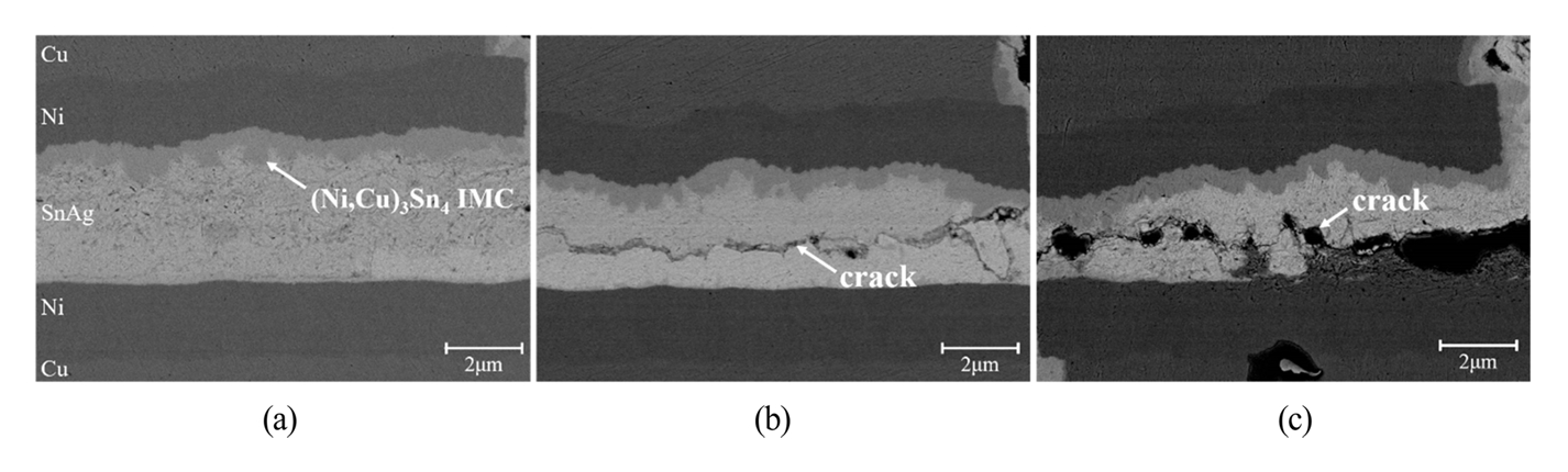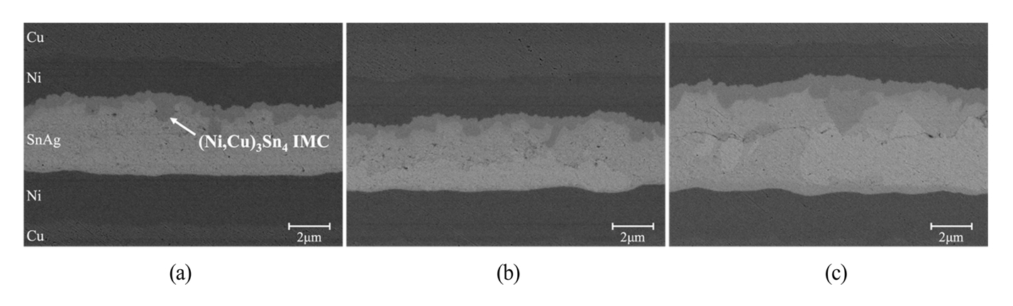 이러한 결과를 종합하면, 본딩 인터페이스에서 형성된 IMC는 주로 (Ni,Cu)3Sn4로 구성되며, Au는 IMC 형성에 크게 기여하지 않고 Sn 매트릭스 내에서 확산 원소로 존재하는 것으로 판단된다. 이는 Ni 기반 솔더 접합부에서