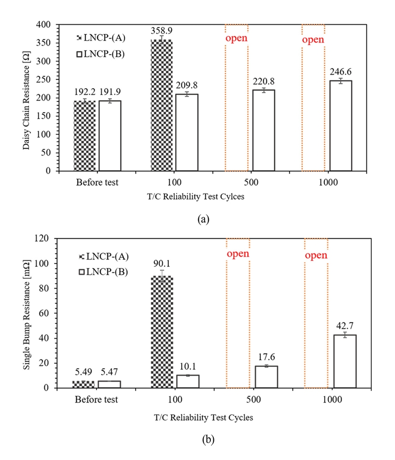 이와 유사한 경향은 단일 범프 저항에서도 관찰되었다. LNCP-(A)와 LNCP-(B)는 모두 초기 저항이 약 5.5 mΩ으로 유사한 값을 나타내었다.