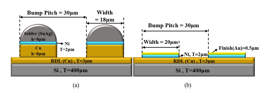 요소 모두 실리콘으로 제작되었다. 표 1에 정리된 바와 같이, 탑 칩의 크기는 7 mm × 11 mm이며, 두께는 400 μm이다. 범프 피치(bump pitch)와 폭(width)은 각각