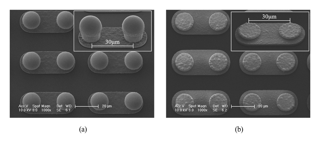 그림 10에 나타낸 바와 같이, LABC 공정 후 후경화 단계를 수행한 샘플에서는 필렛 형성이 확인되었으며, 특히 그림 10 (a)에서는 필렛 형성이 완전하게 이루어진 모습을 명확히 보여준다. 또한, 그림 11의 주사전자현미경 이미지 분석을 통해 30 μm 피치 인터커넥션이 보이드(void), 오픈(open), 쇼트(short) 등의 결함 없이 신뢰성 있게