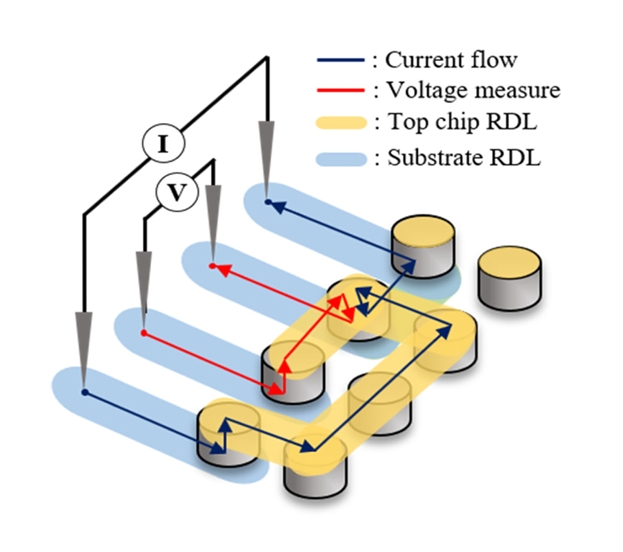 데이지 체인(daisy chain) 측정을 위한 전극 패드(electrode pads)가 포함되어 있어, 모든 범프 간의 전기적 연결성을 검증할 수