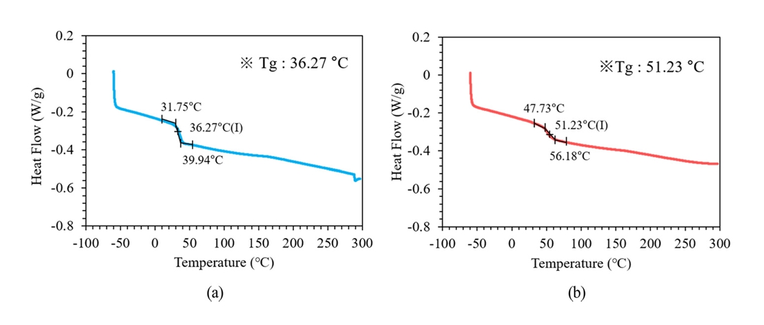 본 연구에서는 LNCP-(A)와 LNCP-(B) 두 가지 LNCP를 제작하여 비교 분석을 수행하였다. 그림 5에서 볼 수 있듯이, 이 두 소재는 유리전이온도 (glass transition temperature, Tg) 에서 차이를 보이며, 측정된 Tg값은