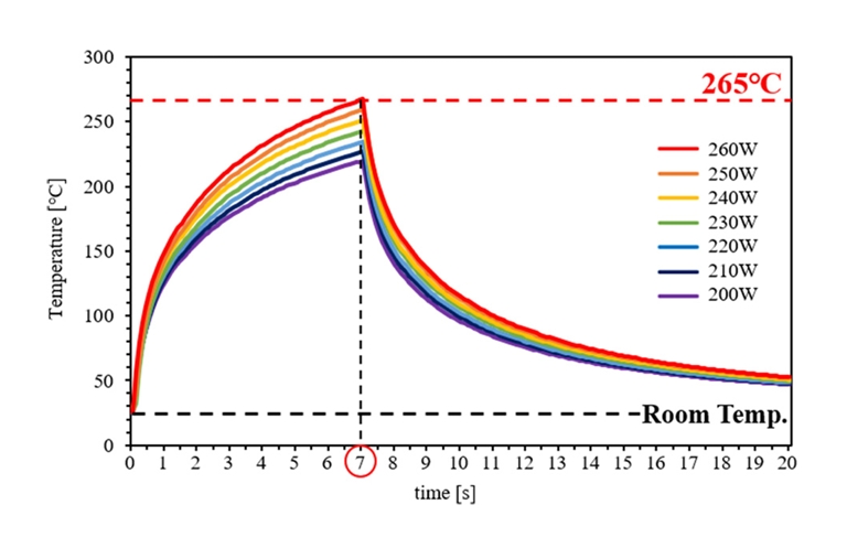 레이저 출력은 200W에서 260W까지 변화시키며 온도 프로파일을 측정하였다. 그림 9는 열전대가 삽입된 테스트 샘플을 이용하여 측정한 온도 프로파일 결과를 나타낸다. 실험 결과를 바탕으로, 최대 온도 265°C를 만족하는 최적의 공정