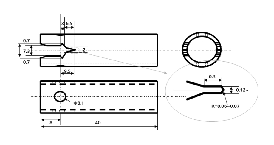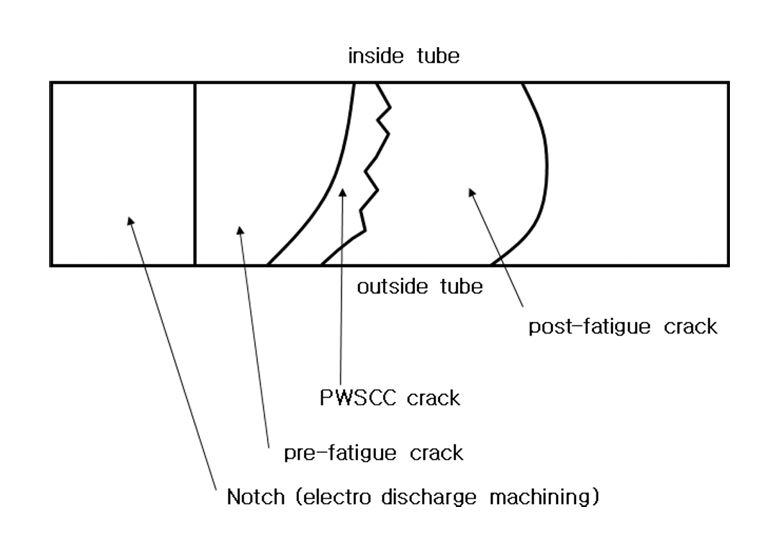 Alloy 600 tube는 그림 1에 보인 double tube compact tension (DTCT) 시험편을 가공하여 PWSCC 개시 시험에 사용하였다. 시편의 노치는 electro