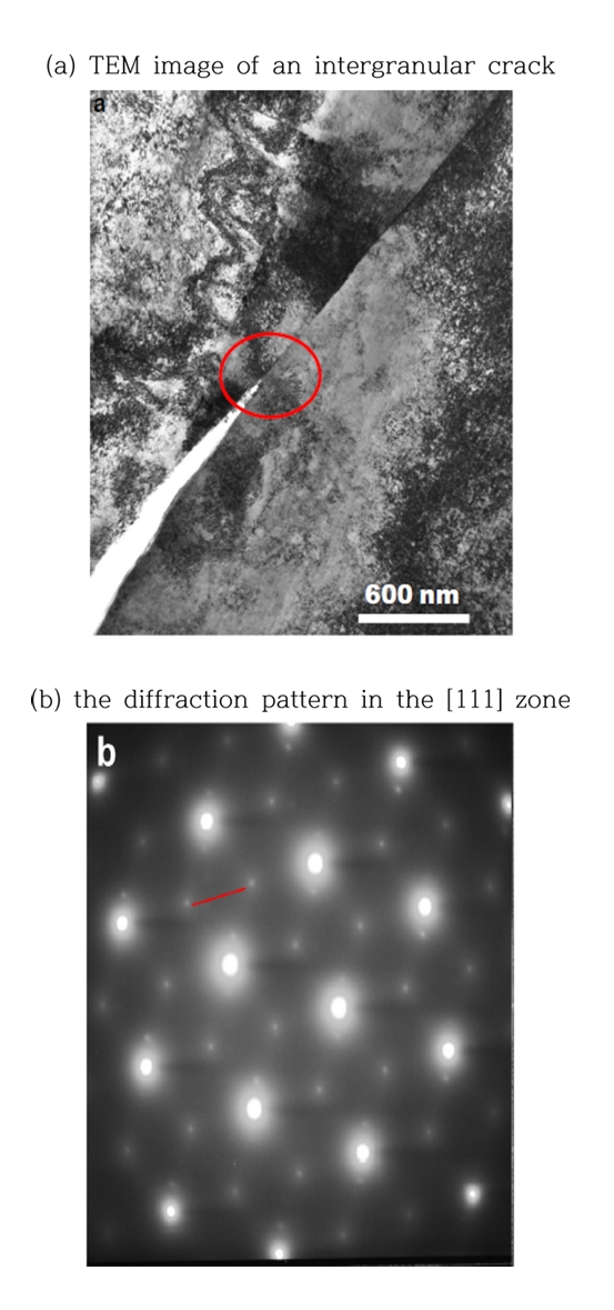 그림 13(a) 및 그림 13(b)는 각각 입계(intergranular) 파괴 영역에서의 TEM 분석 결과와 SADP 결과를 나타낸 것이다. SSRT 실험한 Alloy 600은 그림 13(b)에 보인 바와 같이 1/3(422) 위치에서 diffuse peak이 나타난다. 이렇게 360°C 1차 수에서 SSRT로 파단 실험한 Alloy 600