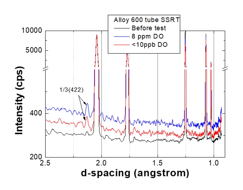 또한, Alloy 690과 Alloy 600의 규칙화 거동은 약간 다르다. Alloy 690은 Fe를 제외하면 Ni:Cr=2:1이고, 이것은 Ni2Cr이라는 규칙상의 조성과 같다. 이에 따라 Alloy 690은 규칙화 처리로 Ni2Cr 장 범위 규칙(long range order, LRO)을 만든다[20,21,25]. Ni2Cr LRO가 형성되면 격자 수축의 크기는 Alloy 600보다 훨씬 크다[21]. 그러나 실제 실험실에서 Alloy 690의 PWSCC를 재현시키기는 어렵다. 이 이유는 Alloy 690은 규칙화되면서 orthohombic