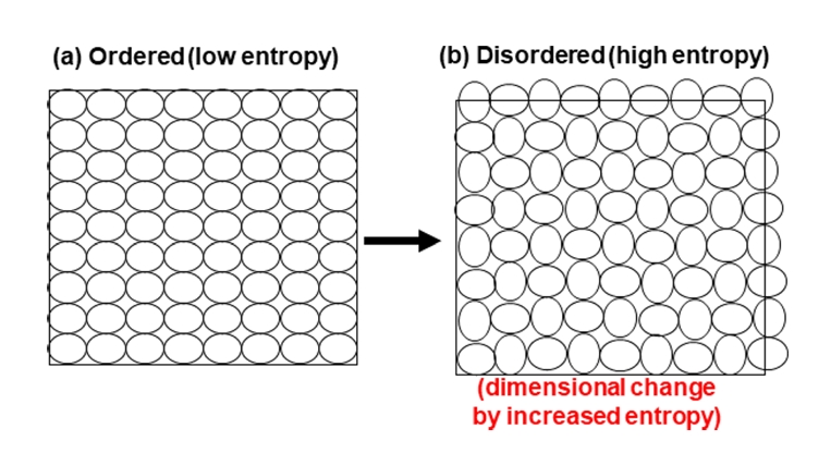 그림 7~10에서 규칙화 처리되어 엔트로피가 감소하면 격자 수축이 일어나는 것을 확인하였다. 엔트로피가 감소하면 물질의 길이가 수축하는지를 생각해 보자. 그림 15는 고온에서 급랭 처리하면 엔트로피가 잔류 되고, 이와 동시에 격자가 팽창하며 물질의 면적(길이2)가 늘어나는 것을 도식적으로 나타낸 것이다[10].