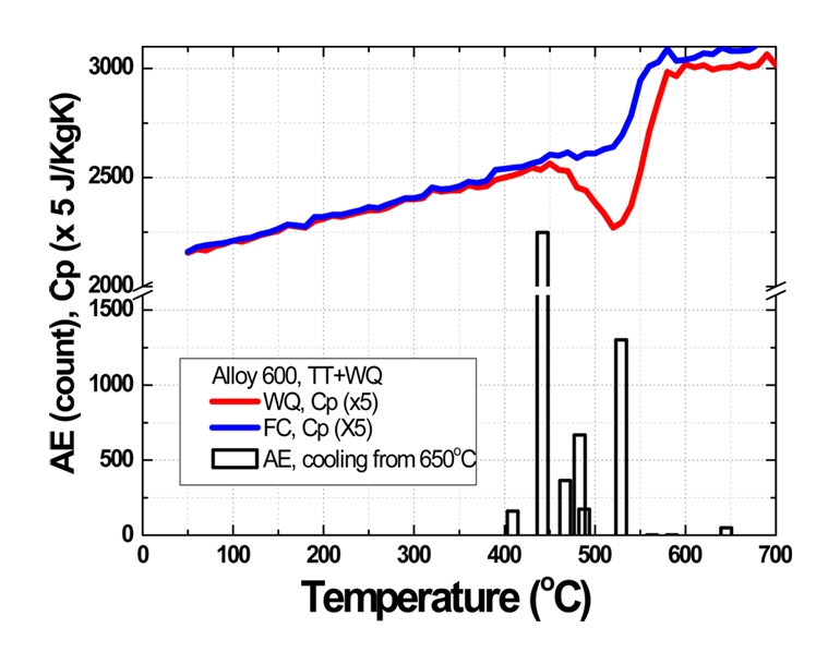 AE)로 확인한 것이다. 규칙 반응에 따른 엔트로피 방출(발열)과 AE counts를 함께 도시하였다. WQ Alloy 600에서 발열 반응이 일어나는