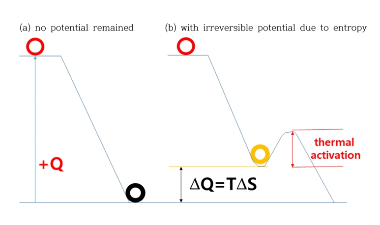 잠재력도 남아 있지 않은 상태이다. 반면 그림 19(b)는 고온의 물체가 WQ 처리되면 평형으로 냉각되지 못하여 바닥 상태까지 가지 못하고 노란색으로 표시된 것처럼 발열량만큼의 잔류 엔트로피가 비가역적