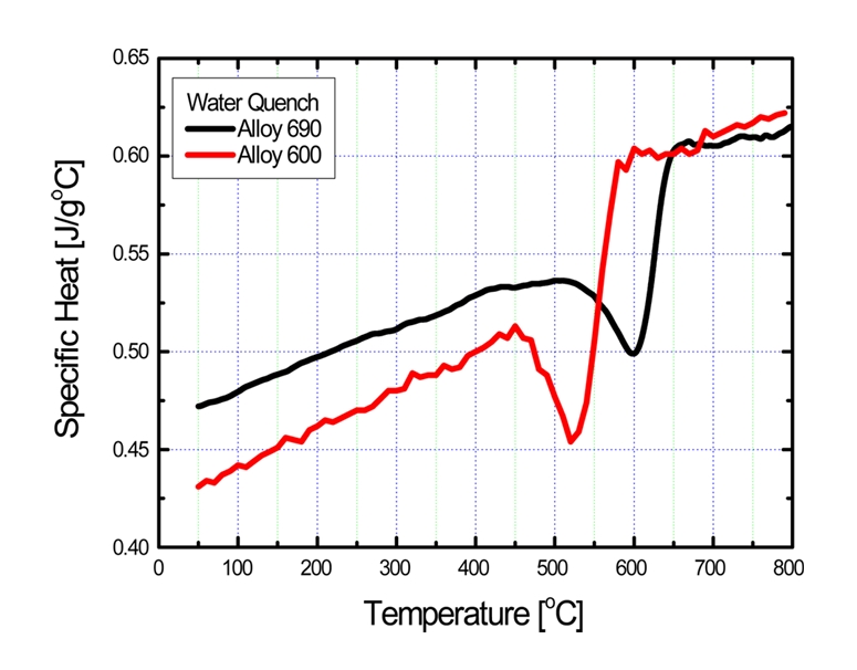그림 21은 1,095°C에서 WQ 처리한 Alloy 600과 1,100°C에서 WQ 처리한 Alloy 690에 대한 비열을 비교한 것이다. 이 두 재료는