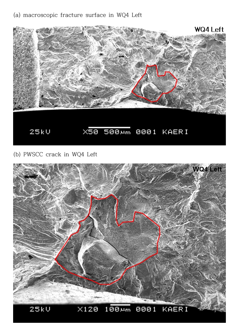 그림 3은 WQ 시편의 PWSCC 개시 파면을 나타낸 것이다. 이 사진의 위쪽은 Alloy 600 tube의 내면이다. 그림 3(a)는 WQ 시편의 파면으로 균열은 왼쪽에서 오른쪽으로 진전하였다. 가장 왼쪽은 EDM notch, 그 오른쪽은 피로 균열, PWSCC 파면의 순서이다.