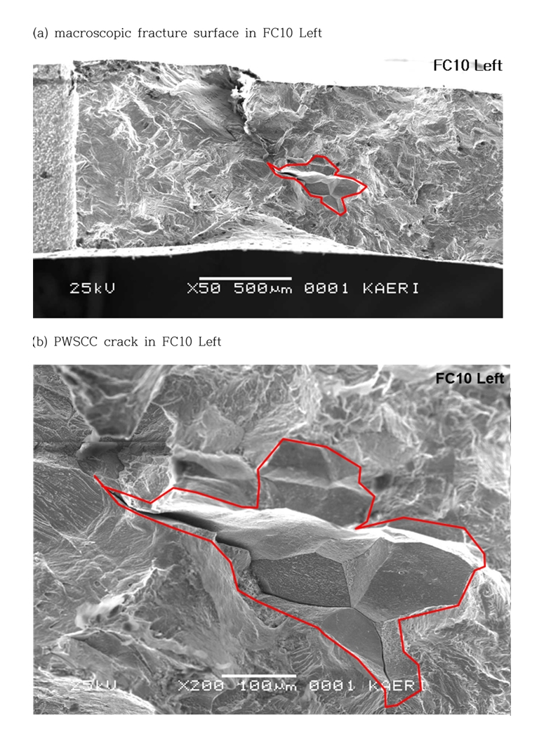 그림 5는 FC 시편에 대한 PWSCC 개시 시험편의 파면을 나타낸 것이다. 이 사진의 위쪽은 Alloy 600 tube의 외면이다. 그림 5(a)에 빨간 선으로 그은 부분은 PWSCC 파면으로 판단된다. 그림 5(b)에는 PWSCC 파면을 확대하여 나타내었다. 입계 표면에는 부식 생성물이 형성되어 있으며 이것은 PWSCC에 의한 파면으로 보인다. 이 시편의 PWSCC는