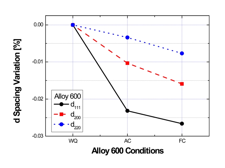600의 냉각 속도는 격자 팽창에 영향을 미친다[12]. 따라서 WQ Alloy 600은 평균 격자 거리가 팽창되어 있다는 것을 알 수 있다.