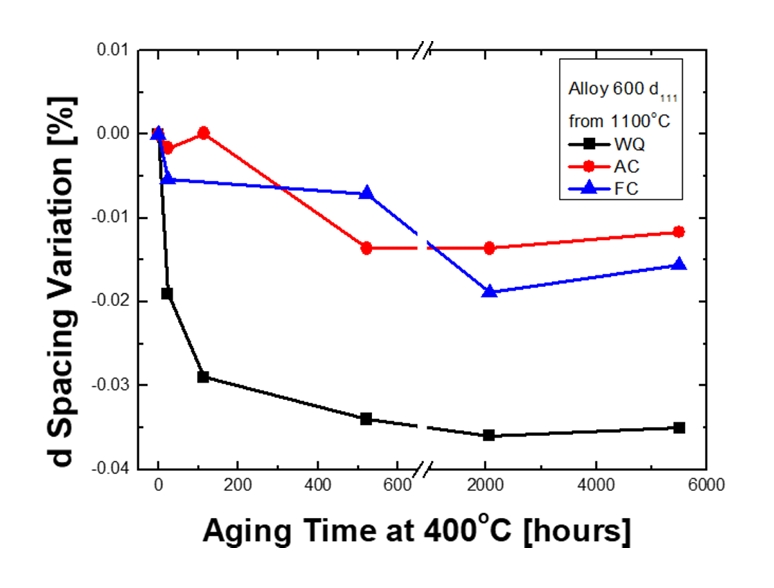 Alloy 600에서 격자 수축 거동에 미치는 냉각 속도의 영향을 살펴보자. 그림 9는 WQ, AC, FC 처리한 시편을 400°C에서 5,500시간까지 규칙화 처리한 후 HRPD로 (111) 격자 수축을 비교한 것이다.