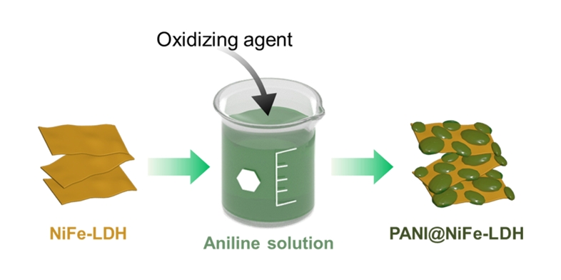 그림 1은 NiFe-LDH에 폴리아닐린(PANI)을 성장시키는 과정을 나타낸다. 공침법을 통해 합성된 NiFe-LDH 분말을 아닐린(aniline)이 용해된