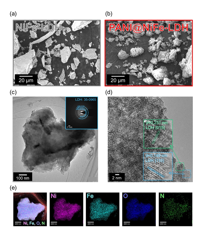 HRTEM) 분석을 통해서도 NiFe-LDH의 (110)과 (015)면에 해당하는 0.149 nm 와 0.231 nm가 명확히 관찰되었다(그림 2(d)). 그러나, PANI와 관련된 회절 패턴은 관찰되지 않았다[31]. 이는 NiFe-LDH 표면에 성장된 PANI가 도핑에 의해 양전하를 띠는 특성을 가지며, 음전하를 띤 전자빔에 의해 조사될 경우 고분자 사슬이