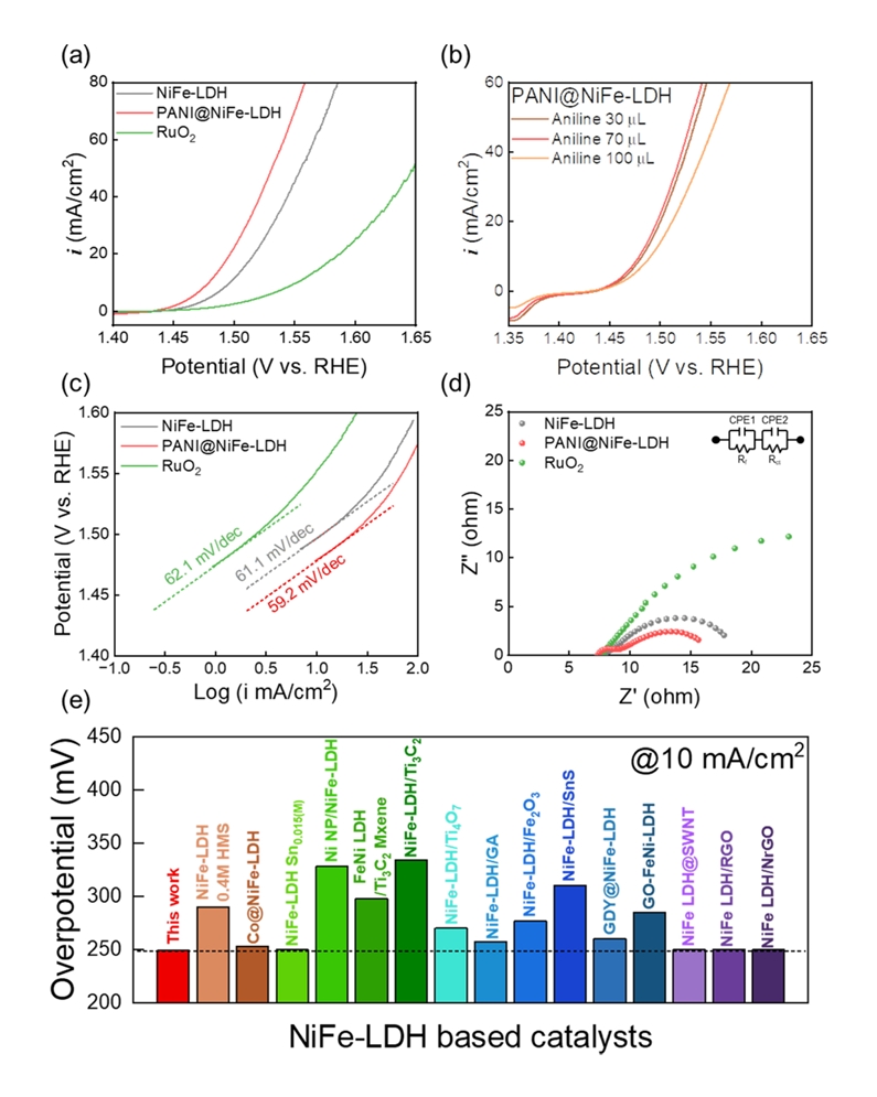 분광법(Electrochemical Impedance Spectroscopy, EIS)을 실시하였다(그림 4(d)). PANI@NiFe-LDH는 고주파 영역에서 기존 NiFe-LDH에는 나타나지 않았던 작은 반원이 추가로 관찰되었으며, 이는 NiFe-LDH 표면을