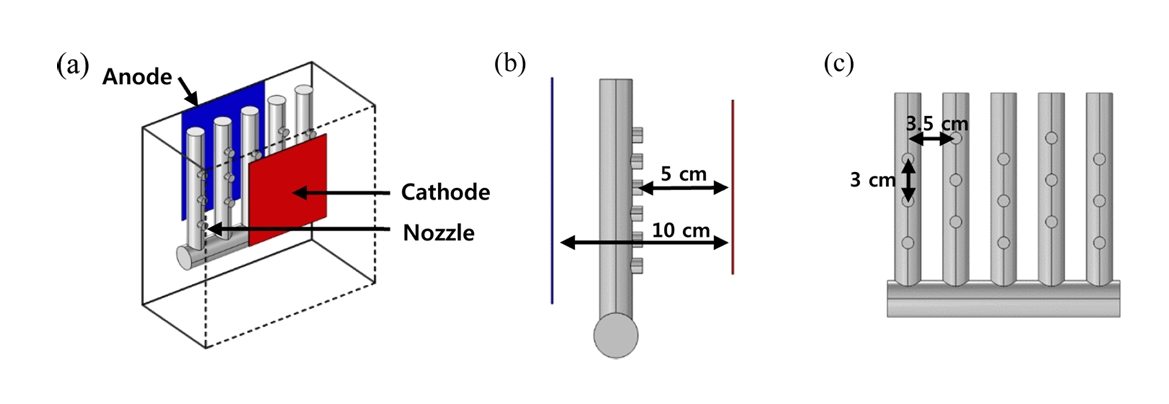 정상 상태 조건으로 수행하였다. 해석에 사용된 경계조건은 표 S2, 모델링은 그림 S2와 같이 구성되었다. 작동 온도는 25 °C로 설정되었으며, 전해질의 전기전도도는 18 S/m로 실측 값을 적용하여 도금 공정의 전해질 환경을 모사하였다.