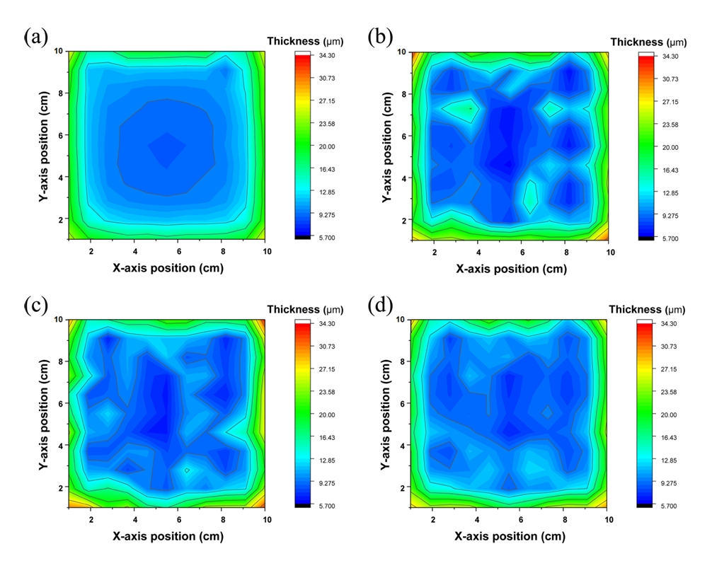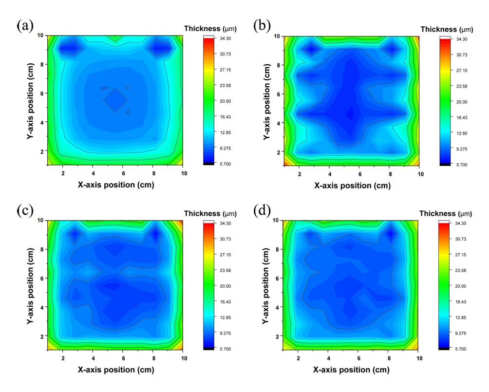 변화만 적용한 조건(그림 9)과, 동일한 유량 조건에서 각각 5 cm/s(그림 10), 10 cm/s(그림 11)의 패들 교반을 병행한 경우를 비교하여 나타내었다. 육안상으로(그림 S7, S8)는 패들 교반을 병행한 경우 노즐 분사에 의한 패턴 무늬가 전반적으로 잘 드러나지 않았지만, 실제 두께 분석 결과 그림 10, 11과 같이 두께 불균일성이 명확히 드러났다.