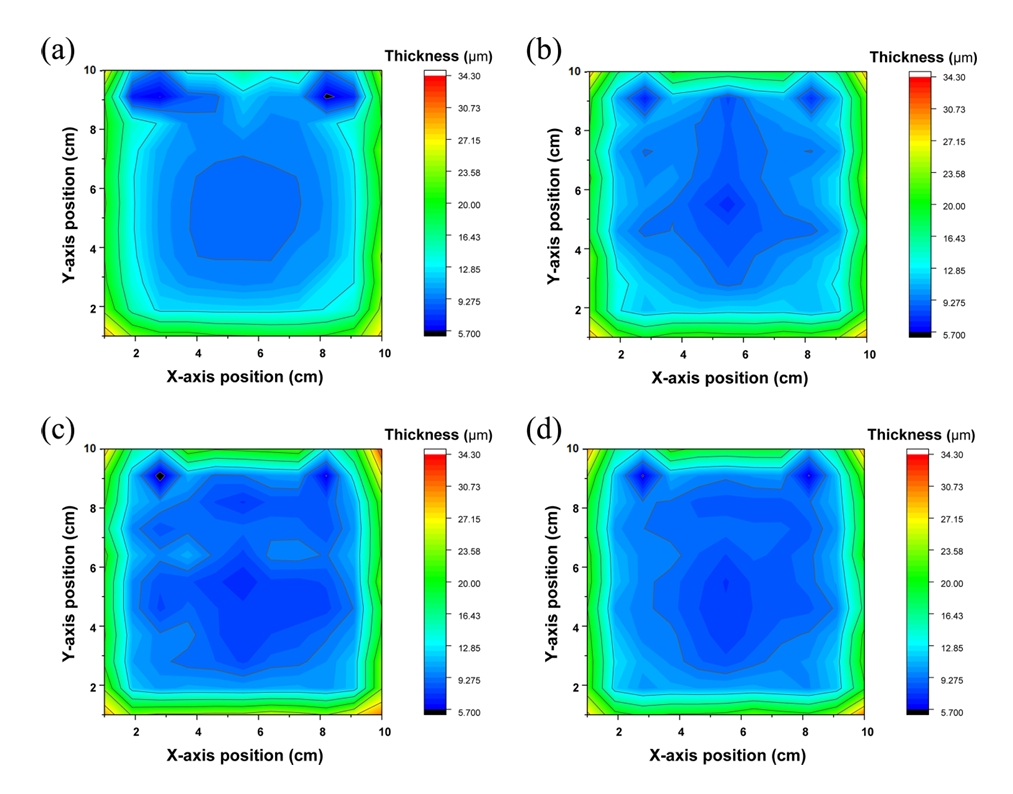 낮은 두께 편차가 확보되었다. 전극 이동을 추가한 경우 전체적인 두께 평탄도가 향상되었으나, 5 cm/s와 10 cm/s 간의 편차 개선 폭은 2.82