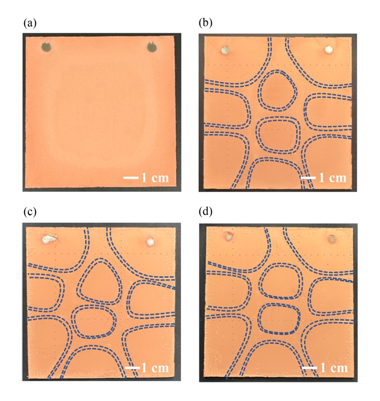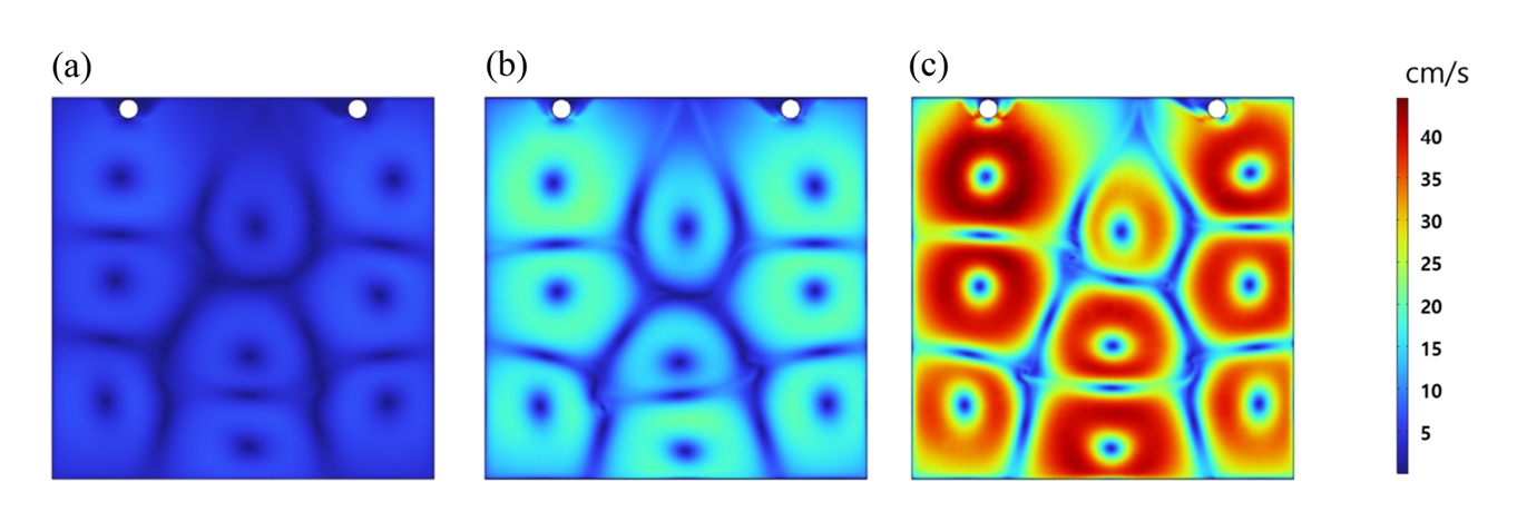 형상을 보였다(그림 2, 3). 이는 분사된 유체가 전극 표면에 충돌한 후 방사형으로 확산되면서 주변부에 상대적으로 높은 유속이 형성된 결과로 해석된다. 특히 다수의 노즐이