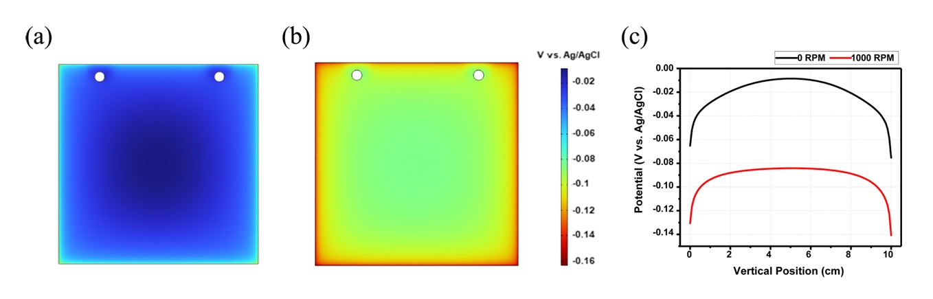 공정에서 유동이 없는 조건(0 RPM)과 유동이 적용된 조건(1000 RPM)의 도금액 분석 값을 경계조건으로 사용하여 전극 표면에 형성되는 전위