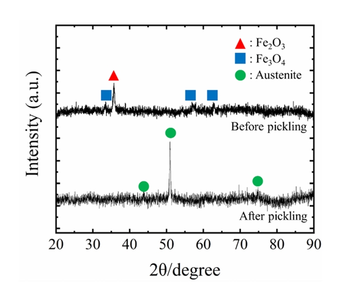 산세 이후부터 표면을 솔로 문질렀으며, 60분 산세 및 솔질 후 산화층은 육안으로 관찰되지 않았다. 추가적으로, X-선 회절 분석을 통해 산세 전후