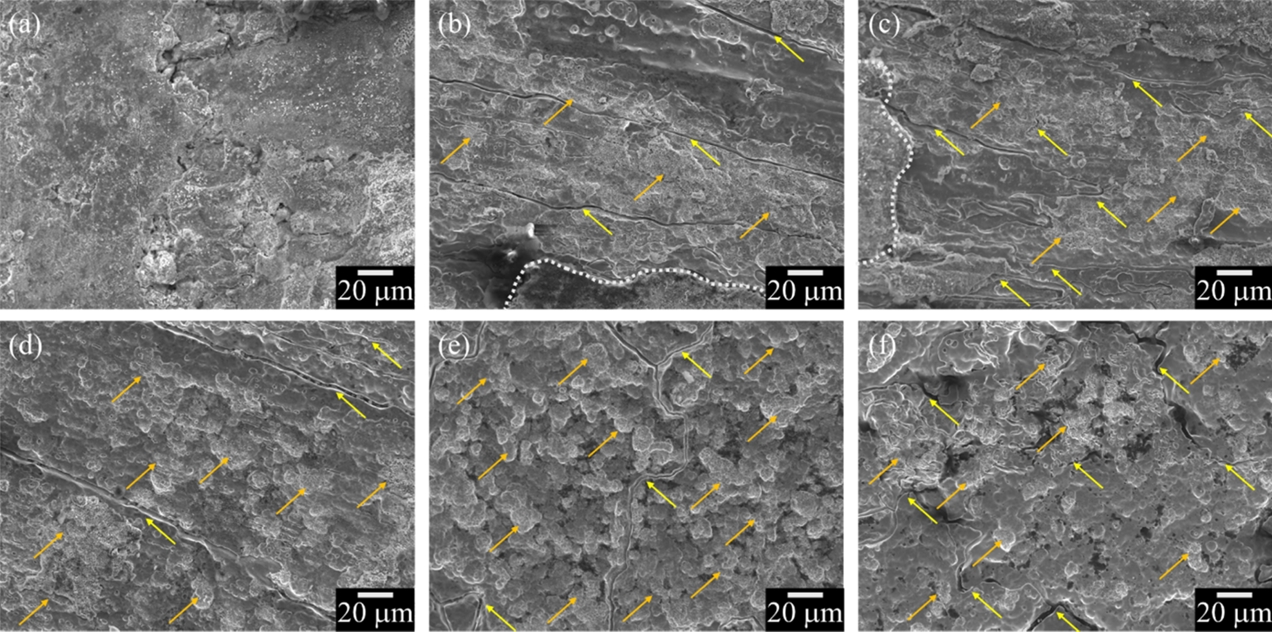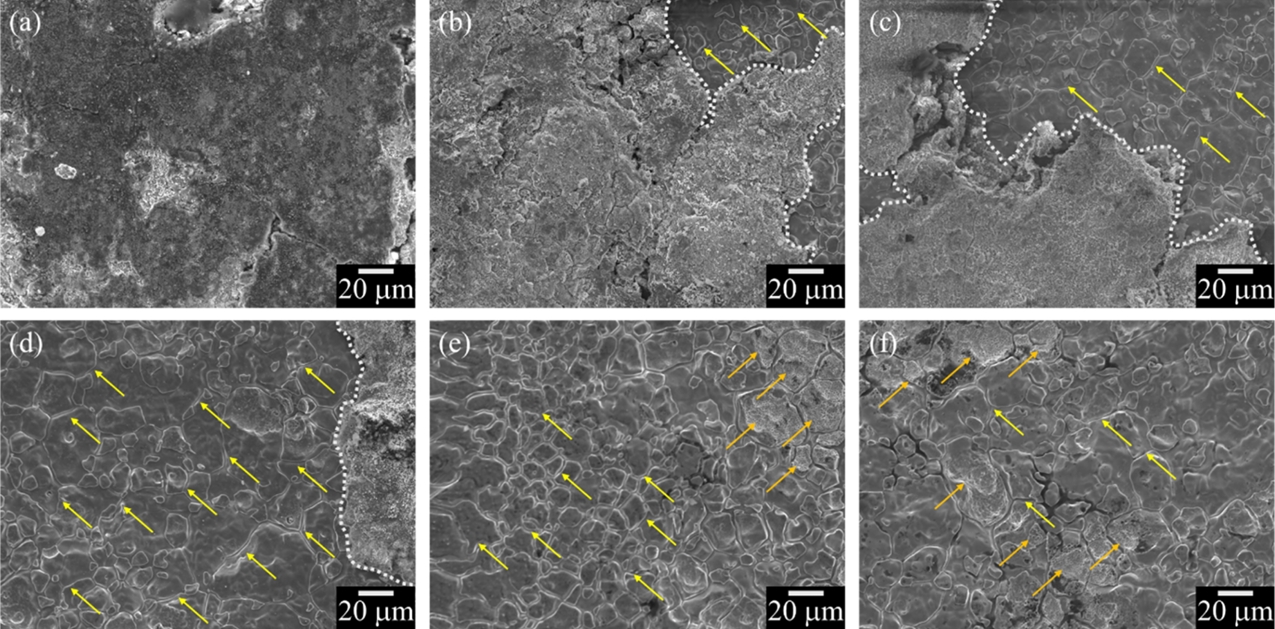 모재가 드러난다(그림 11b, c, d). 특히, 모재의 미세한 결정립계가 두드러지는데(그림 11의 노란색 화살표), 이는 상대적으로 높은 에너지를 가지는 결정립계가 우선적으로 용해(입계 부식)되기 때문이다. 그림 11e, f에서 보이듯이, 산세 시간이 증가할수록 잔존하던 산화층은 제거되고 결정립계 용해가 현저히 촉진된다. 또한, 50분 이후부터는 일부 결정립 내 다공질