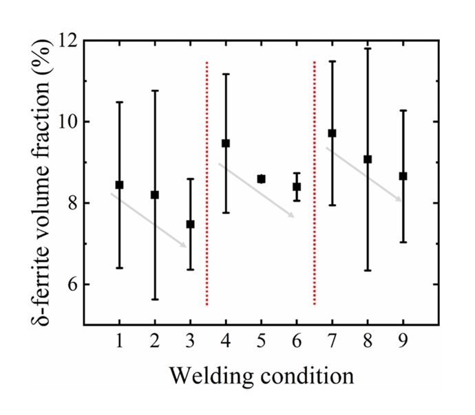 감소한다. 용접 속도가 증가할수록 δ-페라이트의 분율도 증가한다. 입열량이 가장 높은 조건 3에서 δ-페라이트가 가장 적고(7.5±1.1 vol%),