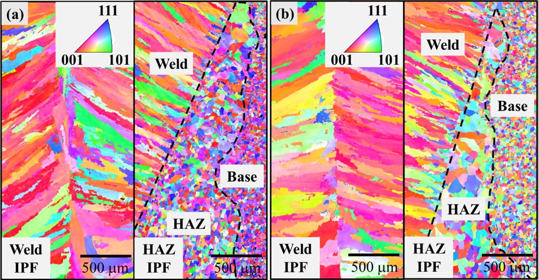 그림 4는 용접 조건 7과 9로 제조된 강관의 용접부 EBSD 분석 결과를 나타낸다. 역극점도를 보면, 용접부에서는 열이 방출된 방향을 따라 결정립이 성장한