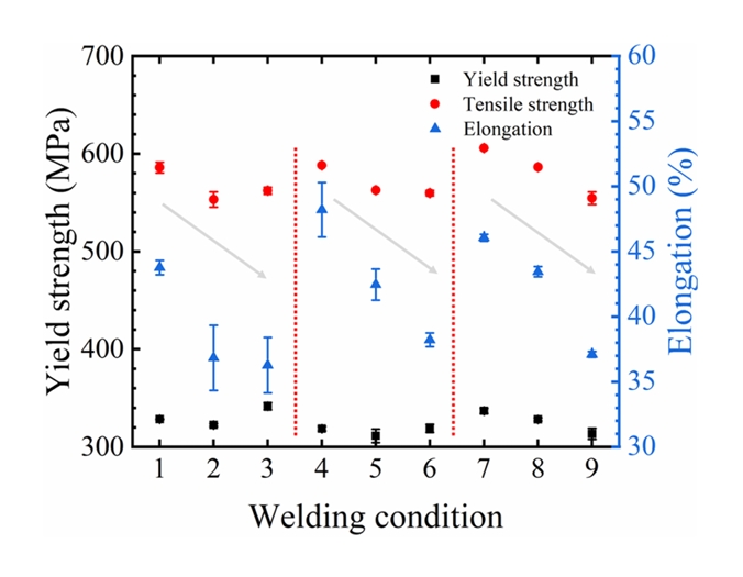 분율, 결함, 결정립 크기에 영향을 받는다[25,29]. 기존 연구에 따르면 δ-페라이트의 분율이 증가할수록, 연성과 균열 저항성은 증가하지만 강도는 낮아진다[25,30]. 또한, 높은 용접 속도에서는 용접부 내 결함을 형성시켜 낮은 강도를 나타낸다[29,31-33]. 그리고, Hall-Petch 방정식에 따라, 결정립 크기(또는 2차 수지상 간격)가 줄어들수록 강도가 증가한다[34]. 연신율 또한 결정립 미세화로 인해 증가한다고 알려져 있다[35]. 본 연구에서 용접 조건에 따른 δ-페라이트 분율의 차이는 최대 3 vol%이다. 반면, δ-페라이트의 분율에 따른 기계적 특성 변화를 보고한