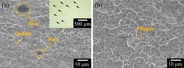모든 용접 조건에서 인장 시편의 파단은 모재가 아닌 용접부에서 발생하였다. 그림 6은 입열량이 가장 높은 용접 조건 3(그림 6a)과 가장 낮은 용접 조건 7(그림 6b)의 파단면을 나타낸다. 두 파단면 모두 딤플(dimple)이 지배적으로 관찰되며, 연성 파괴가 주 기구임을 알 수 있다. 조건 7보다 3에서 더