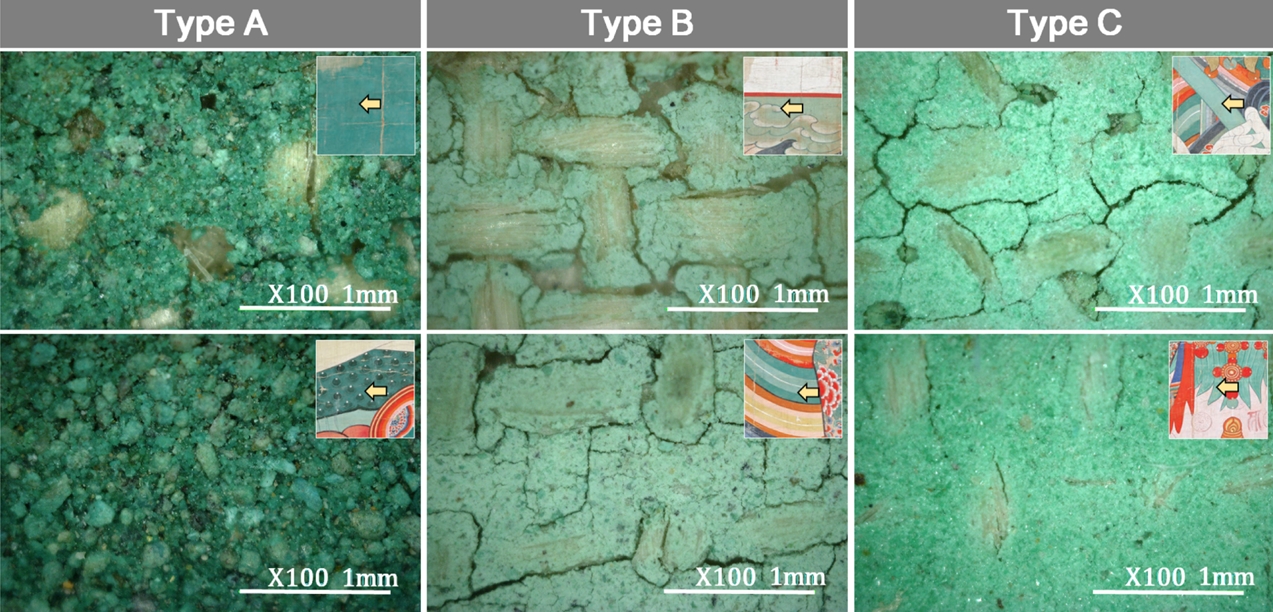 사진에서도 녹색 안료 입자와 백색 입자가 혼합된 것이 관찰되어 Pb는 연백(2PbCO3·Pb(OH)2)과 같은 납 계열의 백색 안료에서 기인된 것으로 추정했다. C 유형은 Cu만 검출되며 연녹색을 띤다(그림 1). 대형불화 32점 내 녹색이 채색된 480지점에 대한 안료의 유형별 사용 비율을 확인한 결과, Cu와 함께 Cl이 검출되는 A 유형 안료는 61.9%로,